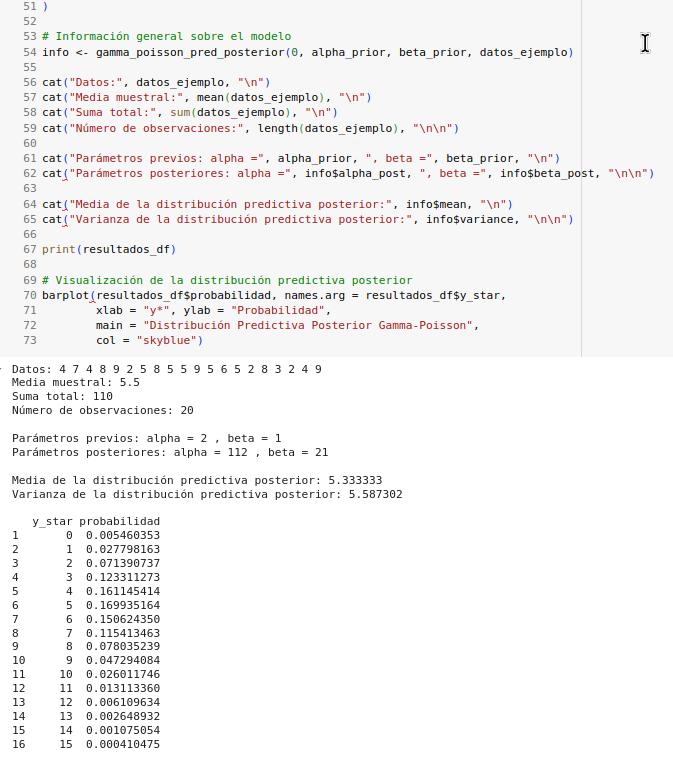 Esta implementación proporciona no solo las probabilidades para diferentes valores de y*, sino también información sobre la distribución predictiva posterior completa, lo que ayuda a entender mejor el comportamiento esperado de futuras observaciones.